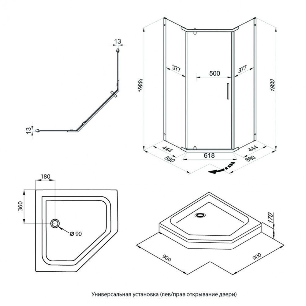 Пятиугольный душевой поддон высотой 170 мм со съемным экраном