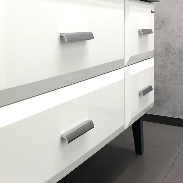 Тумба-умывальник с четырьмя выдвижными ящиками оснащенными системой плавного закрывания. Оригинальные эргономичные металлические ручки. Фасады окрашены белой глянцевой эмалью.