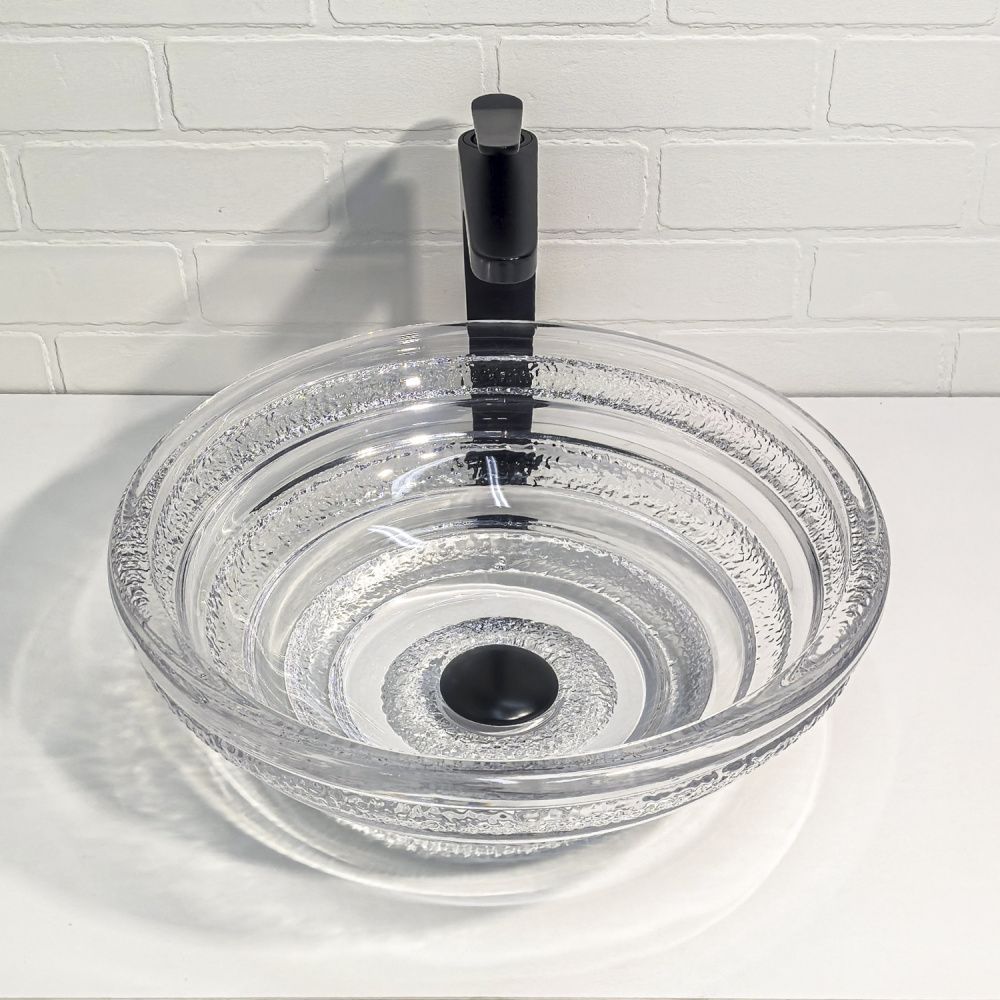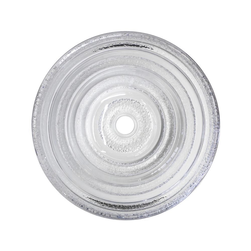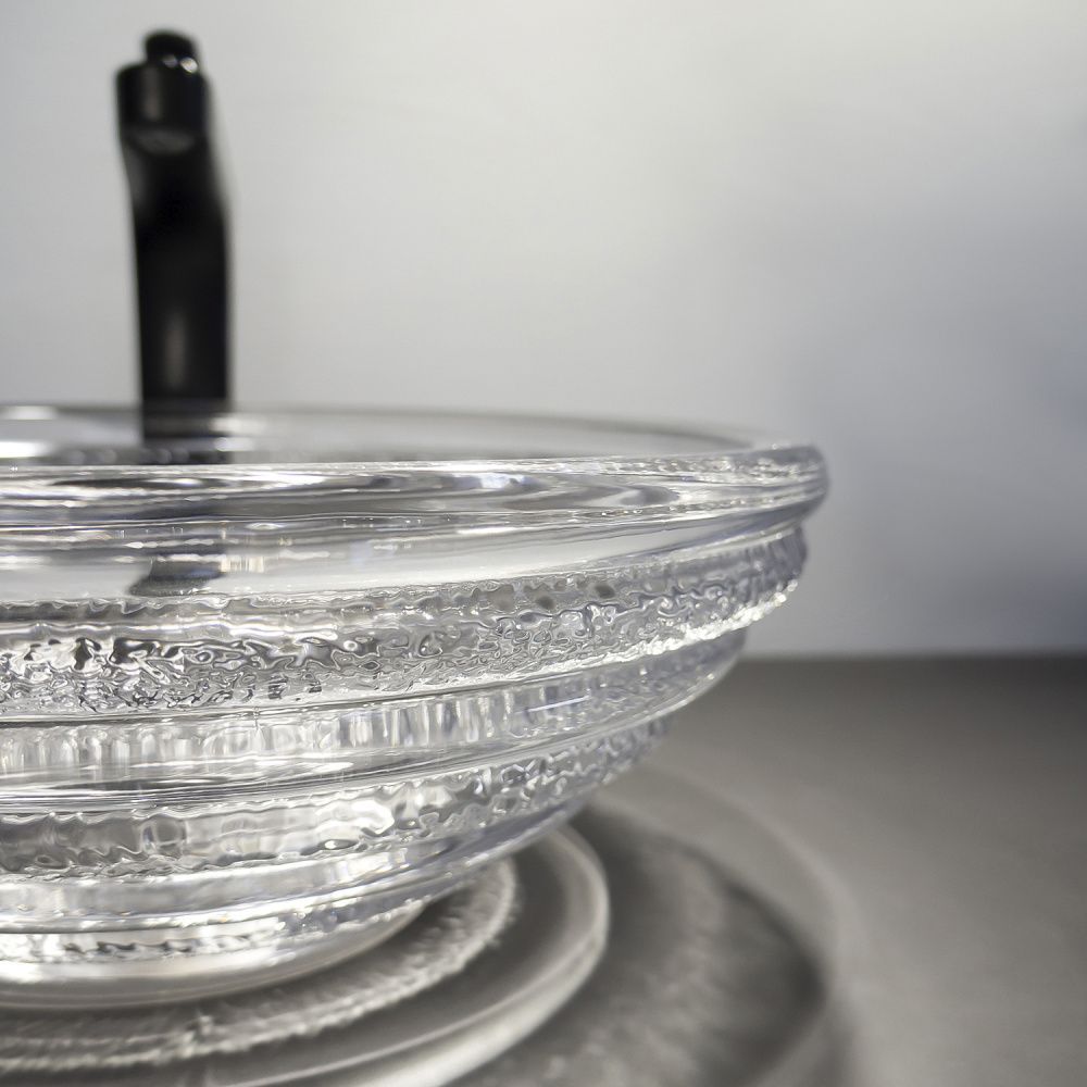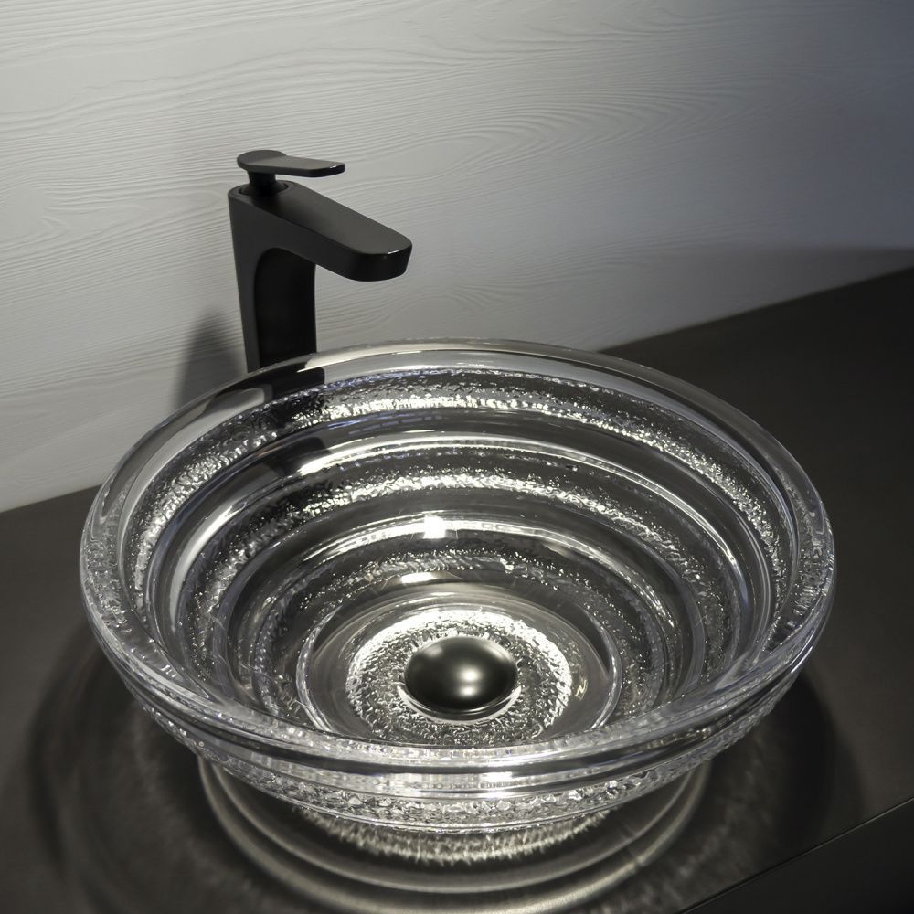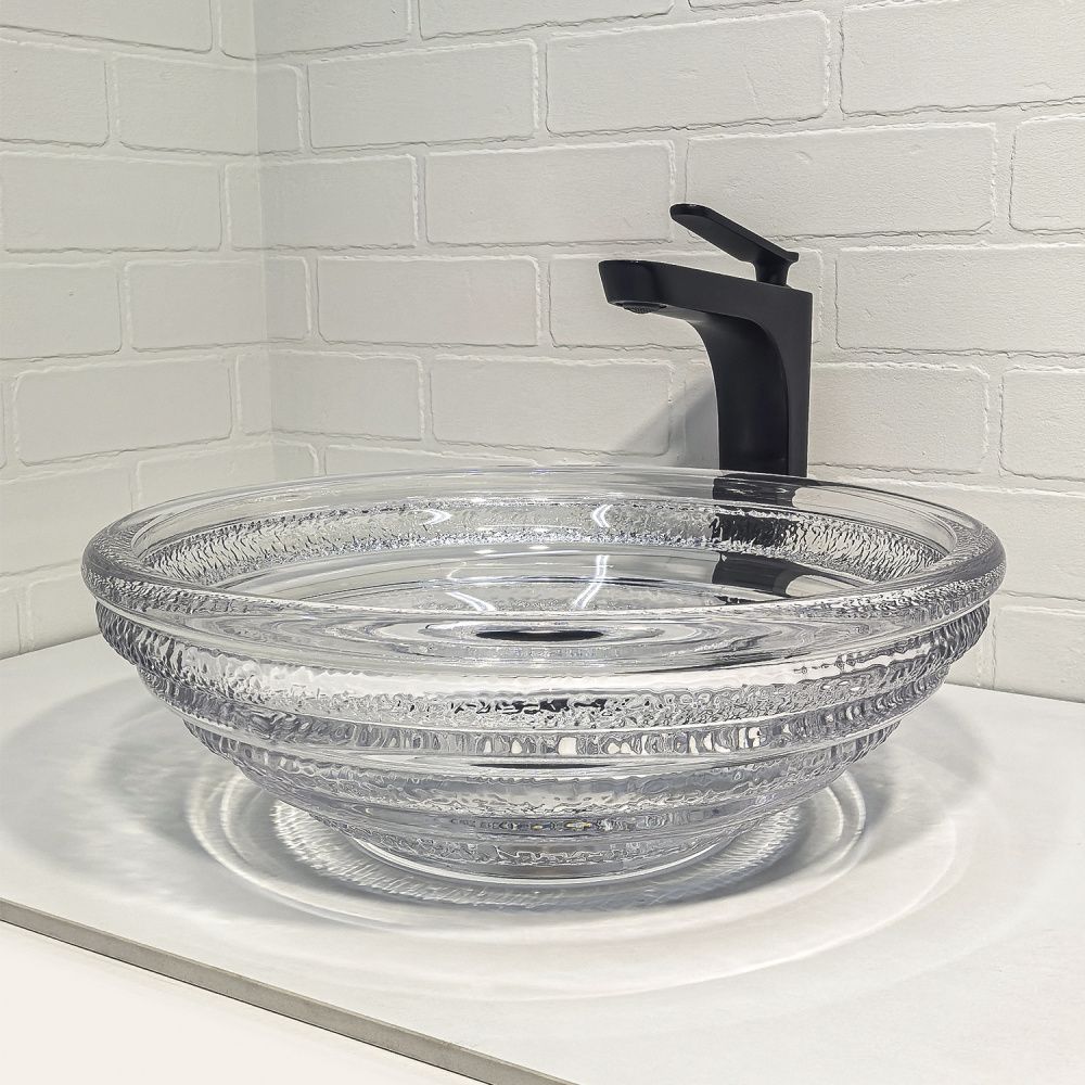 Эффектная накладная раковина круглой формы из прозрачного закалённого стекла станет ярким акцентом в современной ванной комнате. Многоуровневые кольцевые ребра создают игру бликов и отражений, визуально напоминают расходящиеся круги на воде и подчёркивают чистоту линий.